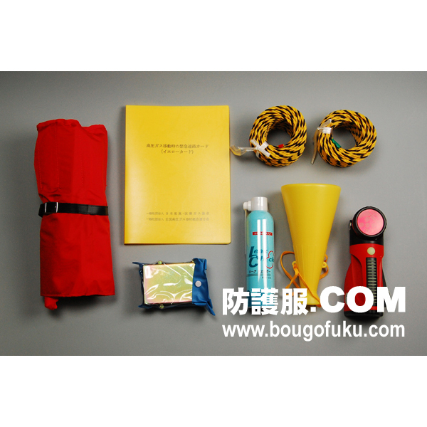 高圧ガス保安法により、酸素ガス、可燃性ガスおよび毒性ガスを積載する車両に携行が義務付けられています。運転席等の見えやすい場所、あるいは本工具セットと共に携行をお願いします。 |